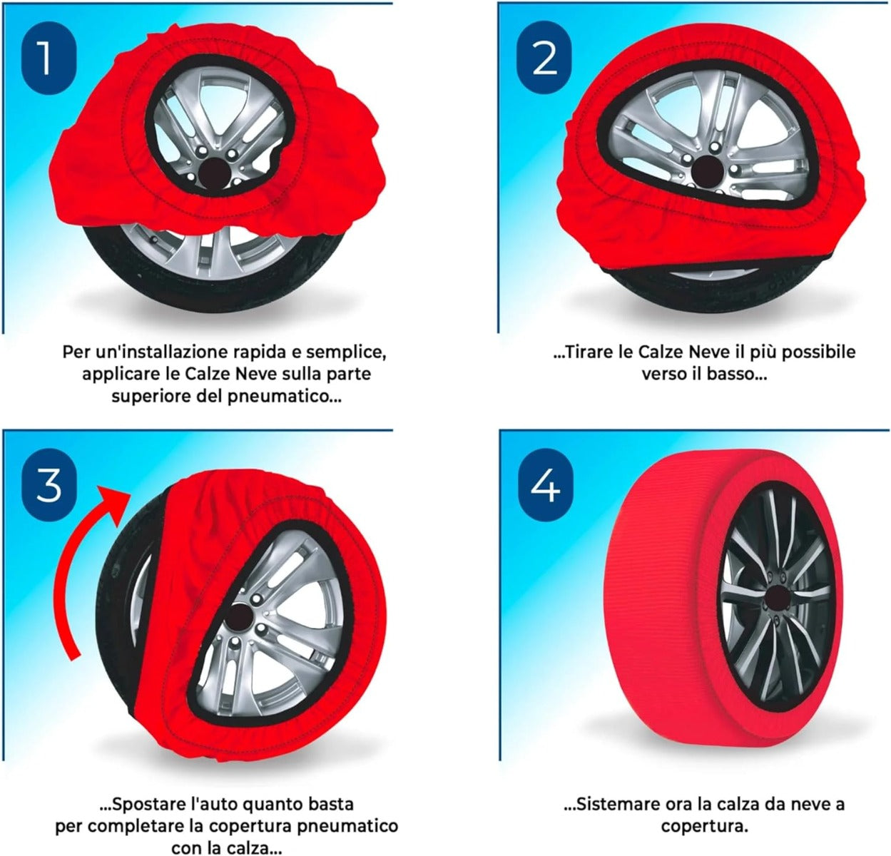 Le nostre calze da neve per pneumatici sono leggere e molto più semplici da applicare rispetto alle catene da neve tradizionali. Ecco come installarle rapidamente: