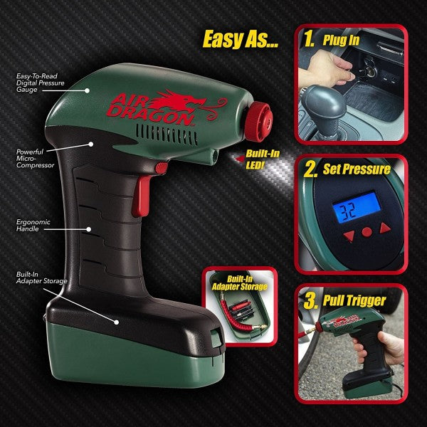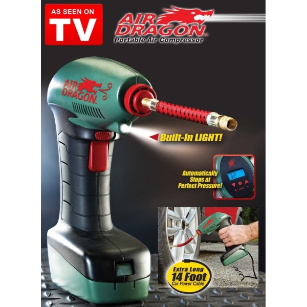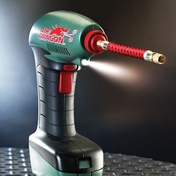 Il compressore Air dragon è capace di gonfiare rapidamente e in tutta sicurezza ogni tipo di pneumatico: perfetto per le gomme di auto e biciclette, per i materassi ad aria, per i lettini gonfiabili, per palloni da gioco ed addirittura le ruote delle carriole. La soluzione ideale in ogni situazione d'emergenza!